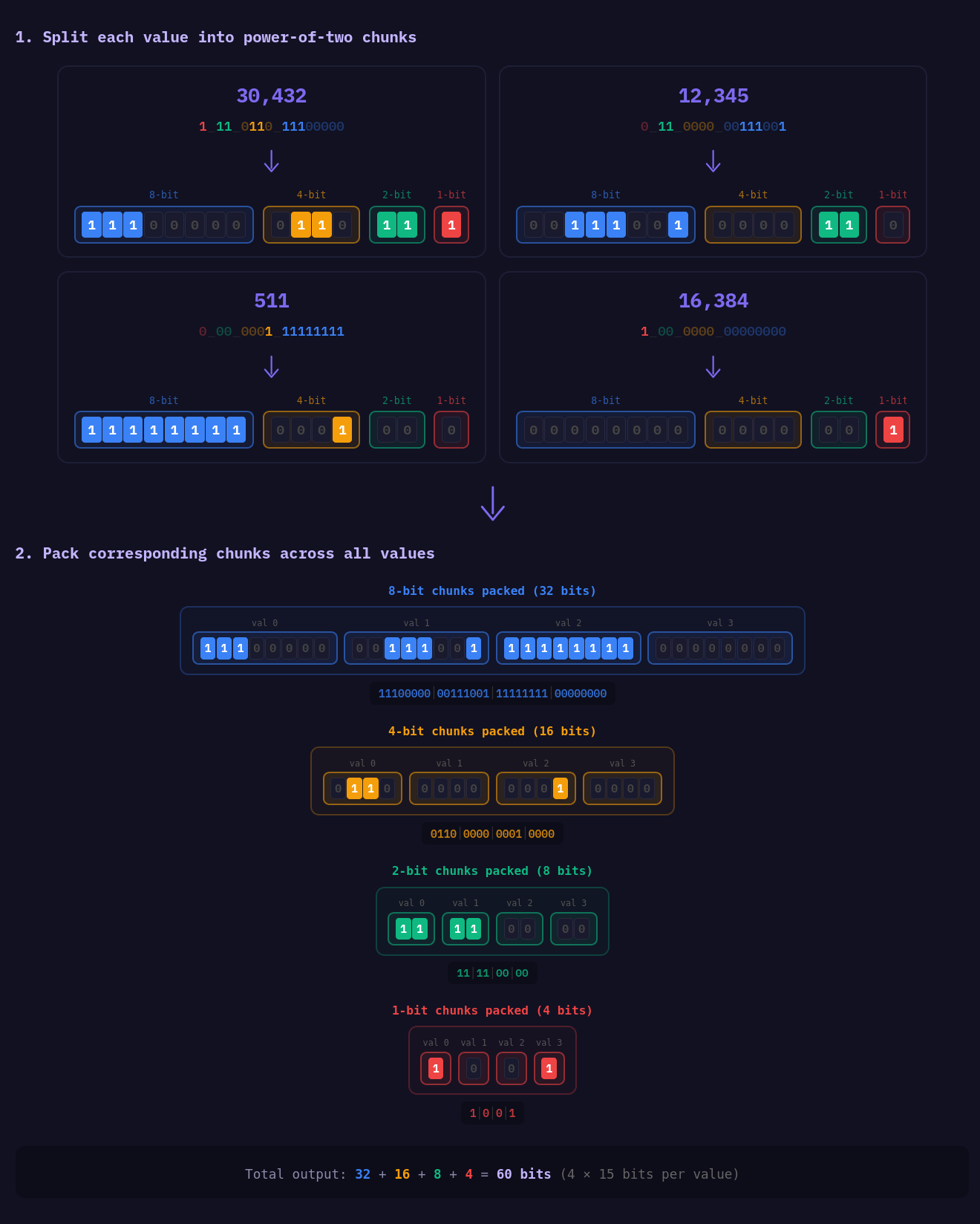 So instead, we split each integer into parts where each "part" is some power of two number of bits, i.e. 1, 2, 4, 8, 16, 32 bitlengths. We do this because all of the SIMD instruction sets we support have some way of converting to and from these different bitlengths efficiently. For example, in AVX2, we have _mm256_packus_epi32 , and on the ARM side, with Neon, we have vqmovun_s32 . Although not all of these instructions have the same result layout, which I will cover a bit later, they can still be used to efficiently convert into these core parts.