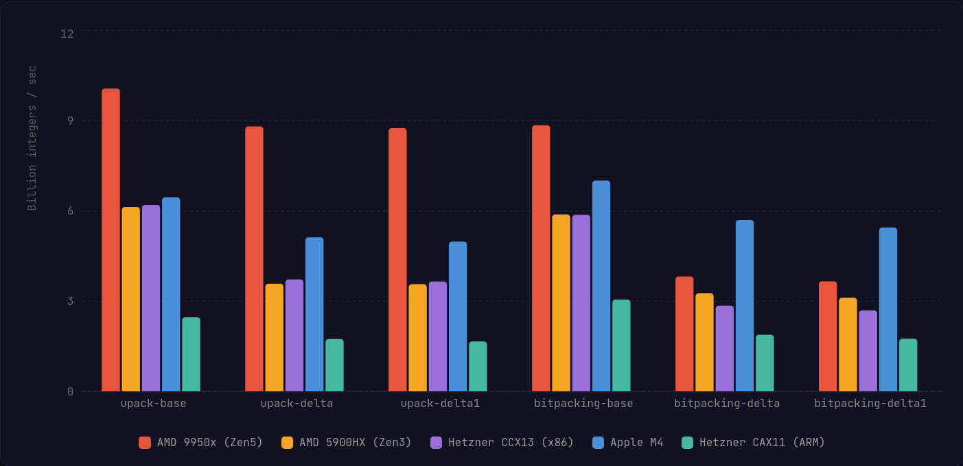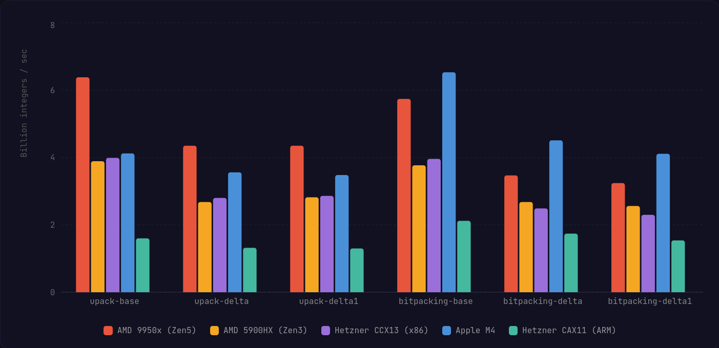 That said, this algorithm should catch up and surpass the simdcomp version as newer ARM-based server CPUs adopt SVE2 and wider registers. We're already starting to see these chips appear on Google Cloud Platform and Microsoft Azure.