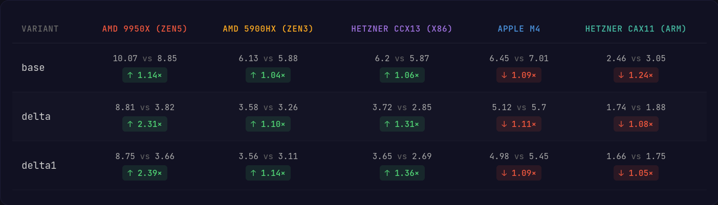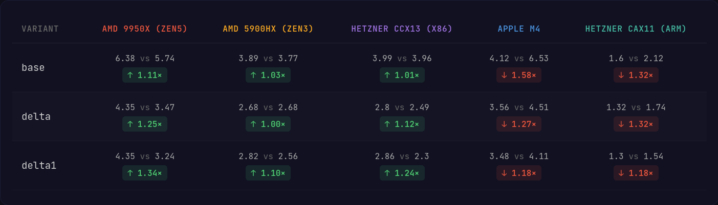 Overall, x86 sees a minor improvement on average across all variants when the AVX2 instruction set is supported by the processor. On the AVX512 machine using the Zen5 microarchitecture, we can really see where the wider registers and more versatile instructions can push the performance forward.