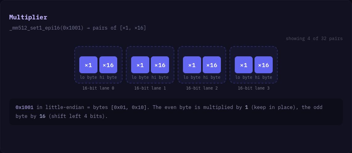 Given an ordered set of 8-bit integers, if we interpret that input as 16-bit integers, we can then use _mm512_maddubs_epi16 (Or AVX2 _mm256 equivalent) combined with a mask of 0x1001 . We can combine adjacent pairs of nibbles into a single 16-bit integer that can then be easily converted to 8-bit integers that contain the packed nibbles.
