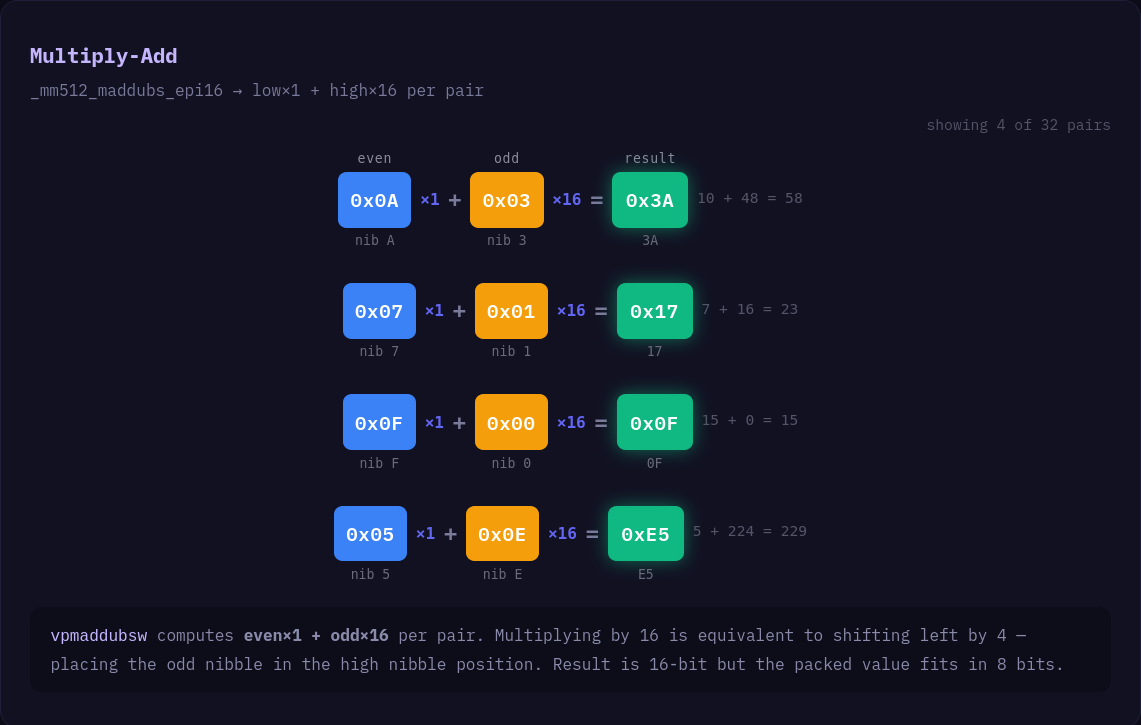 # Use maddubs trick to pack nibbles together while