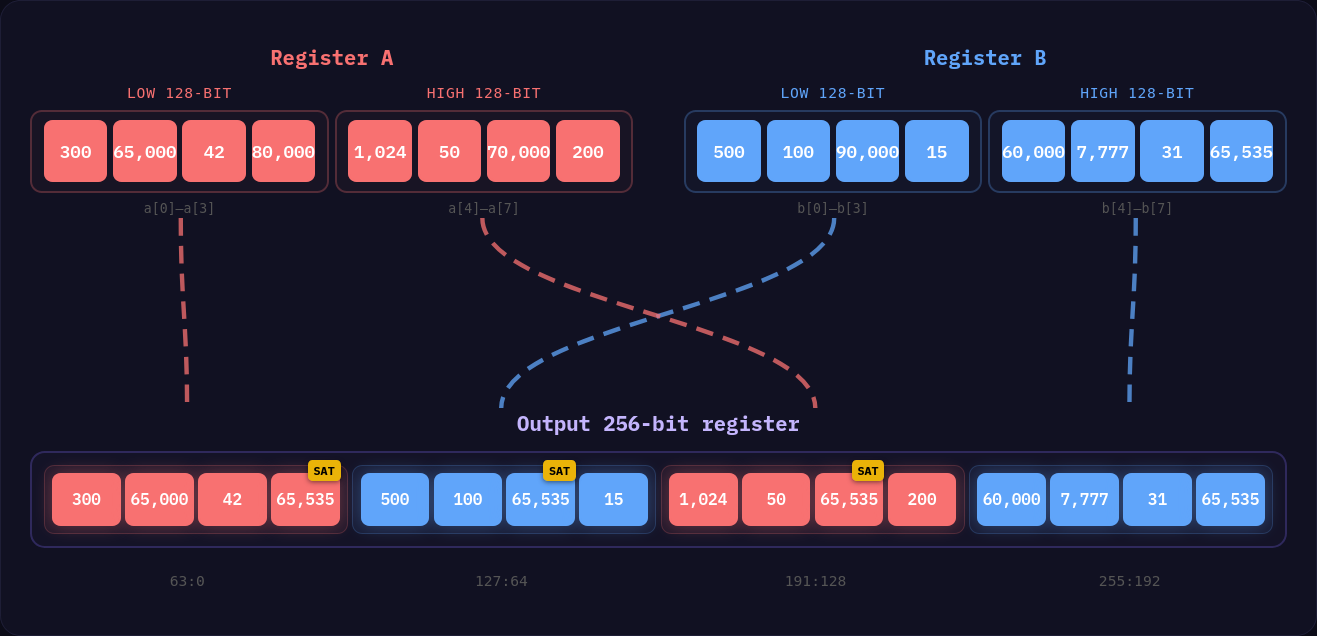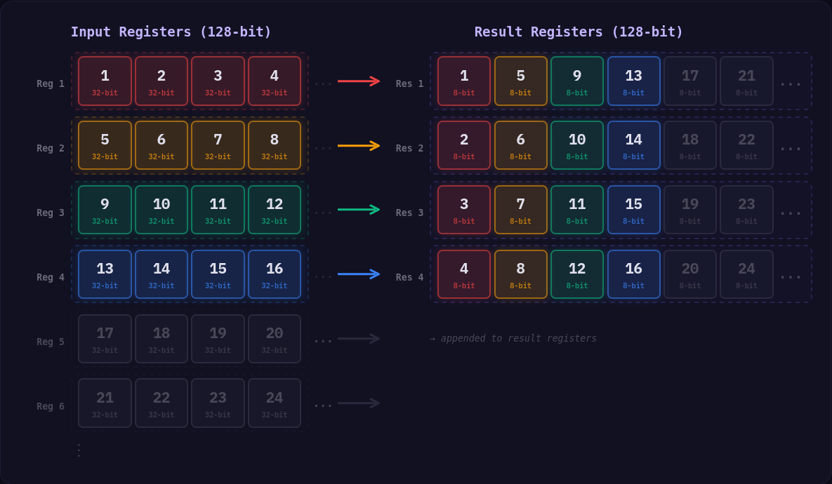 This instruction works in blocks of 128 bits and interleaves the results alternating between register A and register B in the output. This is an incredibly efficient instruction that makes the shuffling simpler, as we only need 32-bit lanes in the case of packing a 32-bit integer to an 8-bit integer (128 bits -> 64 bits -> 32 bits), or 64-bit lanes in the case of packing 32-bit integers to 16-bit.