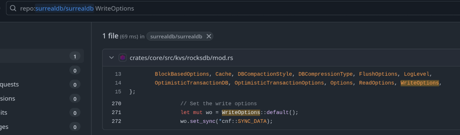 The docs blur the line between flushing to the OS and actually issuing a fsync. The only option I can find that explicitly declares that it will issue one of these calls before returning is WriteOptions.sync = true So let's see if Surreal does this, we can look for WriteOptions from the rocksdb crate to find where they're initialising the transaction.